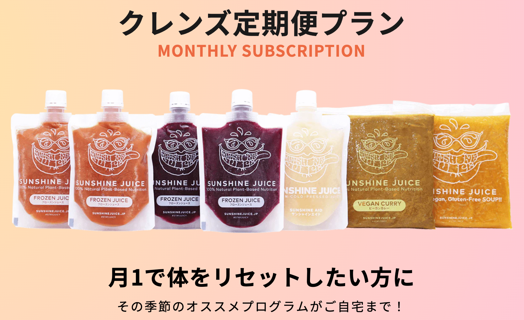 「SUNSHINE JUICEの定期購入」は、「ジュースクレンズプログラム」「デイリージュース」「new moon juice club」の3種類備えており、それぞれお客さまの生活スタイルやペースに合わせて体の調子を整えることができる商品を大変お得に購入することが可能となっています。