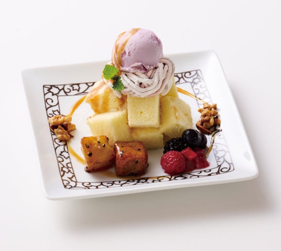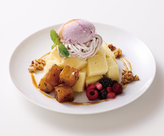しっとりとした食感が特徴の元町シフォンに、モンブランホイップとおいものアイスを添えました。