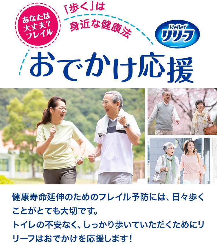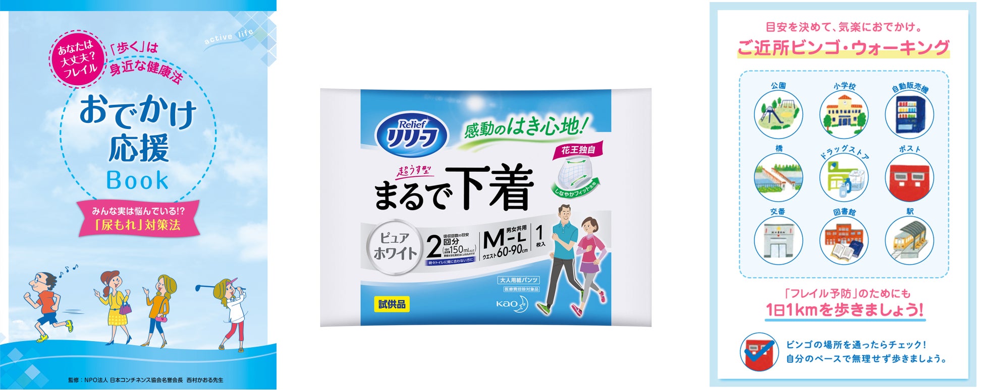 そこで、このたび、2017年より実施しているおでかけ応援教材セットの無償提供をより広げることといたします。軽失禁や頻尿などの症状がある方でも歩行に適した尿ケア品を活用することで、トイレの不安なく外出し、しっかり歩いていただくことを支援する教材セットとなっています。歩き方の提案や薄型おむつの体験を通して、より多くの方のフレイル予防や健康寿命の延伸に貢献してまいりたいと思います。