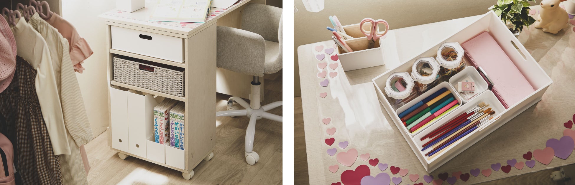 デスクにはキャスターが付いており、移動も収納も簡単。狭いお部屋でも遊べるスペースを確保していただけます。