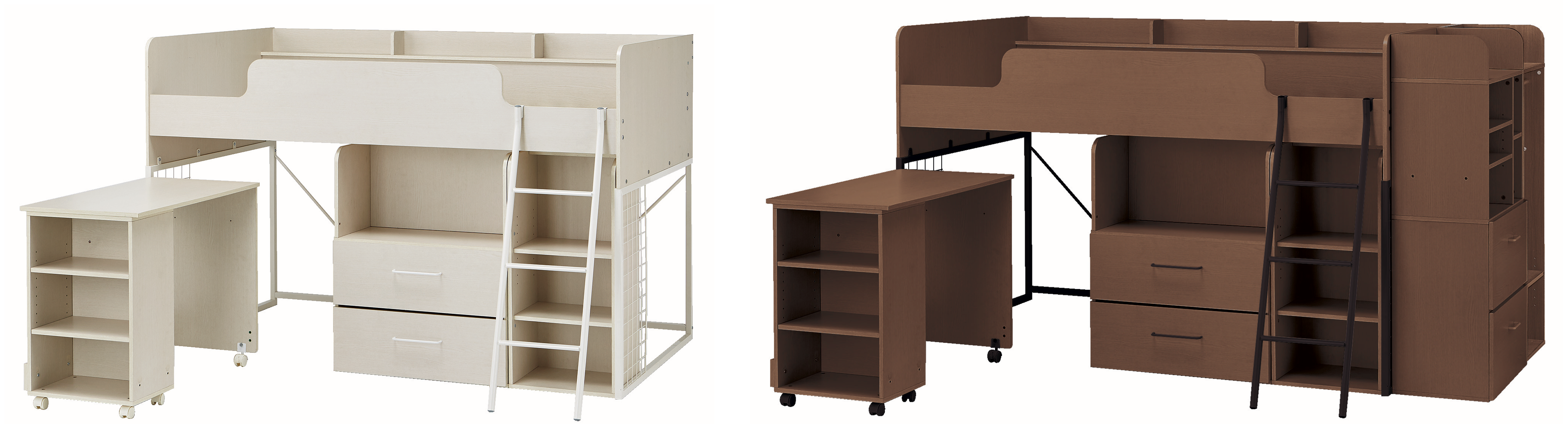 デスクとイスはセットでベッド下に収納可能で、省スペースで最適な学習環境を作ることができます。シェルフ付きデスクは収納部分が左右組み換え可能で、どんなお部屋でも使いやすい仕様です。