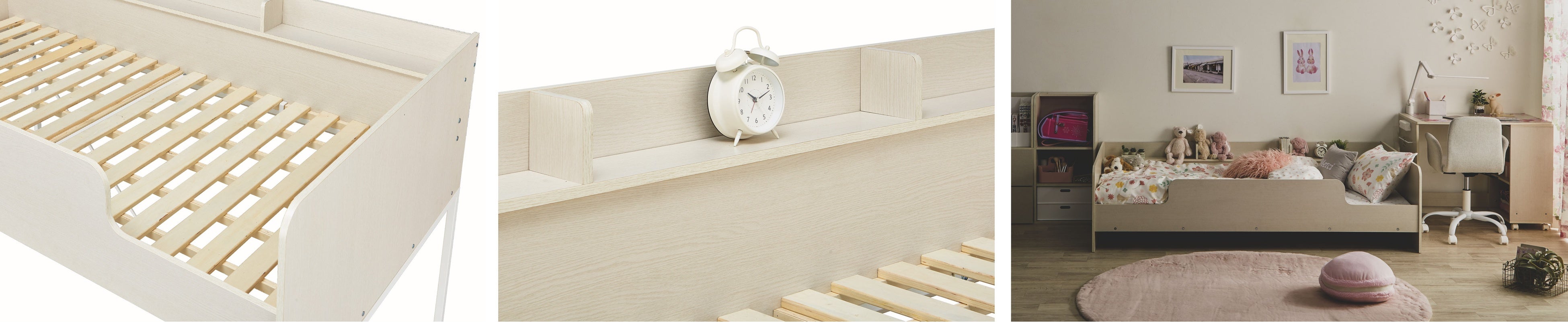 寝心地も通気性も良いスノコタイプのベッド。ベッドサイドには小物が置ける棚付きです。組み替えればベッド単独でも使用できるため、お子様が大きくなってもシングルベッドとして長く使っていただけます。