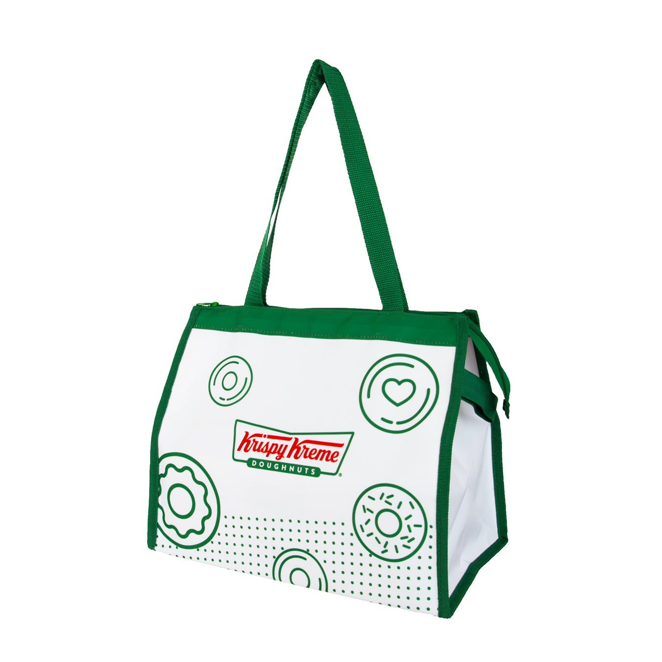 クリスピー・クリームのハーフボックス(ドーナツ6個用)が最大で3箱入るサイズの折りたたみ式クーラーエコバッグ。