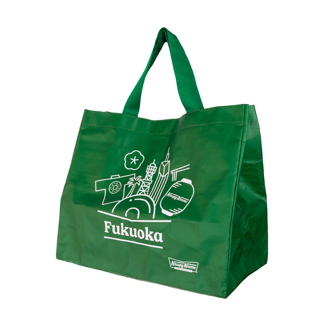 福岡ロゴが入った限定のクリスピー・クリームのハーフボックス(ドーナツ6個用)が最大で4箱入るサイズのリユーザブルバッグです。