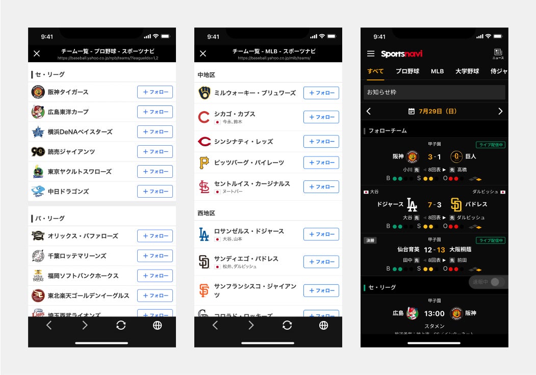 なお、プロ野球は12球団に加え、今シーズンからファーム(2軍戦)に参入したオイシックス新潟アルビレックスBC、くふうハヤテベンチャーズ静岡もフォローできるようになりました。MLBはロサンゼルス・ドジャースをはじめ、全30チームがフォローの対象となります。