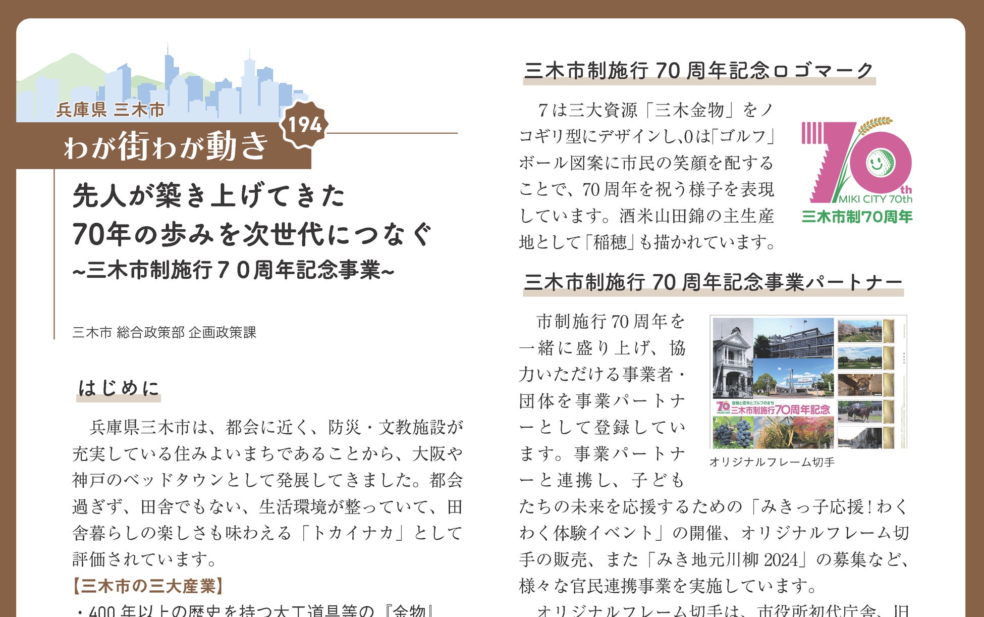 先人が築き上げてきた70年の歩みを次世代につなぐ~三木市制施行70周年記念事業~