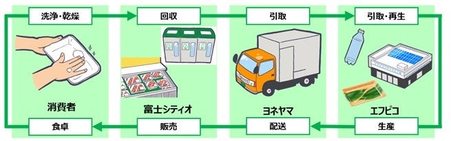 エフピコと富士シティオは「お店がその地域のエコリーダー」となることを目指し、地域の皆様の使用済み食品トレーやペットボトルを富士シティオ店舗にお持ちいただき、店頭に設置している回収ボックスにて回収しております。回収した使用済み食品トレー・ペットボトルはすべてエフピコの資源として活用され、これらの回収資源から製造したエコ製品「エコトレー」「エコAPET」「エコOPET」を再び富士シティオの売り場で使用することで、CO2の排出抑制に貢献しています。回収スキームにおいて、包装資材ディーラーの株式会社ヨネヤマに食品トレーや包装資材の納品配送の帰り便で使用済み食品容器・ペットボトルの引取という形で参画いただいております。今後も消費者の皆様、スーパーマーケット、納品ディーラー、メーカーであるエフピコの4者で協力し、循環型社会の構築に貢献してまいります。