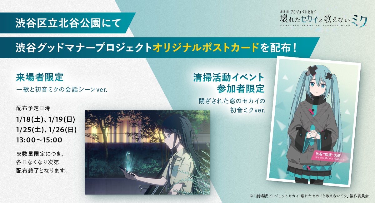 アニメ映画『劇場版プロジェクトセカイ 壊れたセカイと歌えないミク』に登場する「閉ざされた窓のセカイの初音ミク」が、一般社団法人渋谷未来デザインの「渋谷グッドマナープロジェクト」に参画し、「渋谷をキレイに。」をテーマに映画のモチーフとなった渋谷の清掃活動を実施します。渋谷駅からスタートし、劇中で星乃 一歌が「閉ざされた窓のセカイの初音ミク」と初めて会話をしたシーンで登場する「渋谷区立北谷公園」を目指して清掃活動を行います。ご参加いただいた方には「閉ざされた窓のセカイの初音ミク」が描かれた、渋谷グッドマナープロジェクト コラボ オリジナルポストカードを配布いたします。