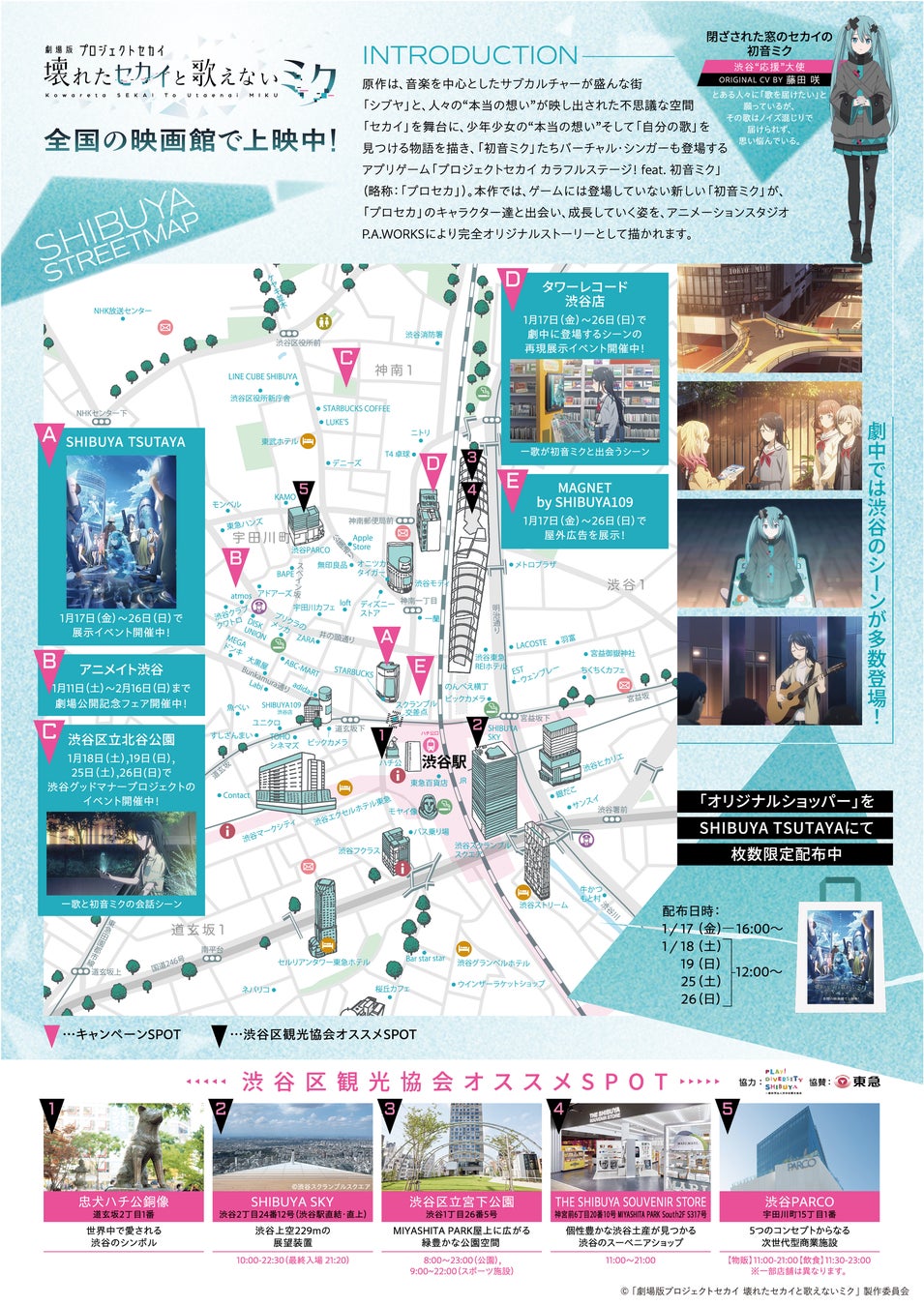 アニメ映画『劇場版プロジェクトセカイ 壊れたセカイと歌えないミク』のモチーフになった渋谷の街を「閉ざされた窓のセカイの初音ミク」が案内するマップを期間限定で配布いたします。