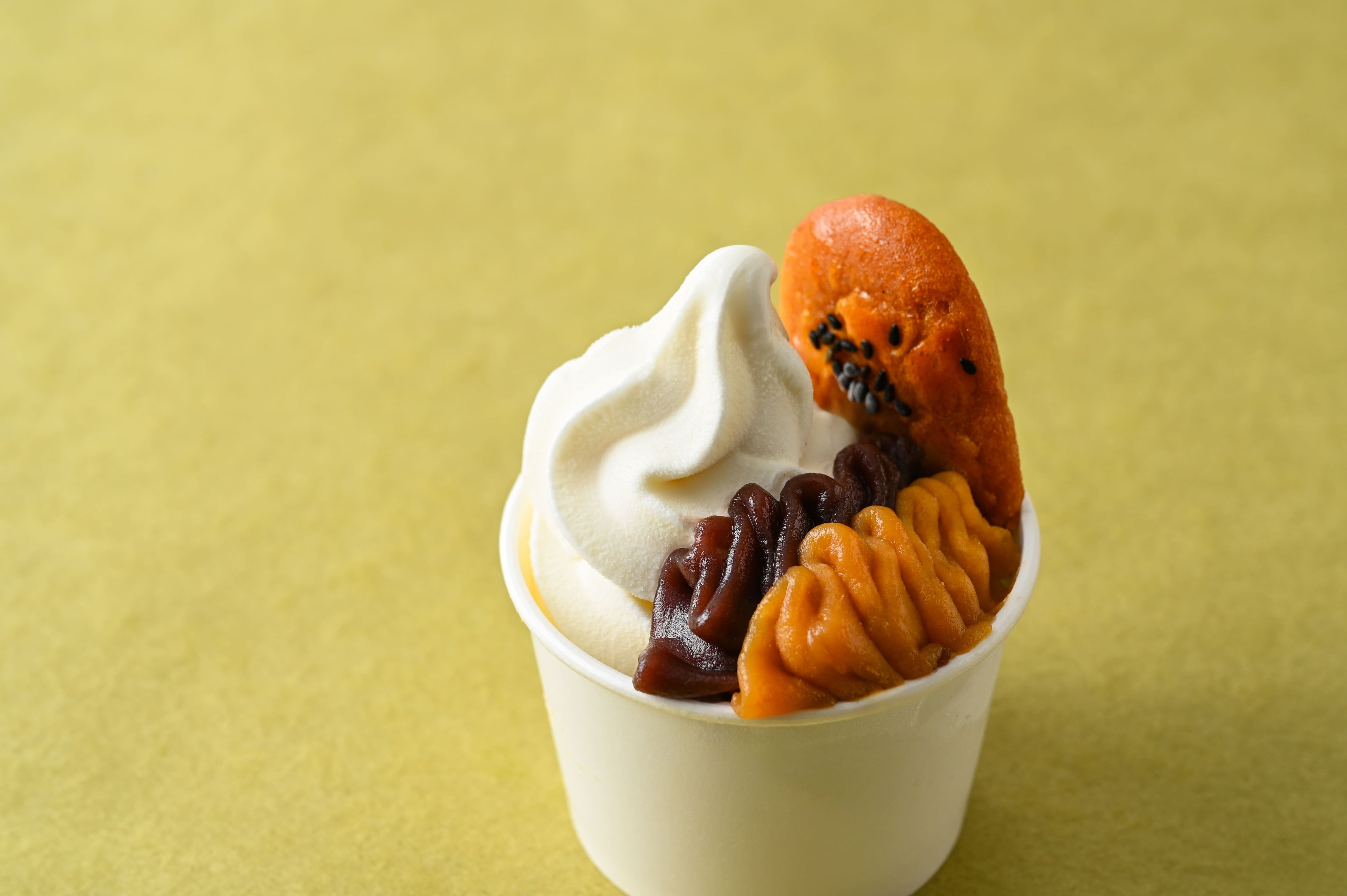 濃厚な甘みのにんじん芋ペーストと口あたりなめらかで小豆の風味広がるこしあん、ミルクの甘さ引き立つソフトクリームと合わせてお楽しみください。