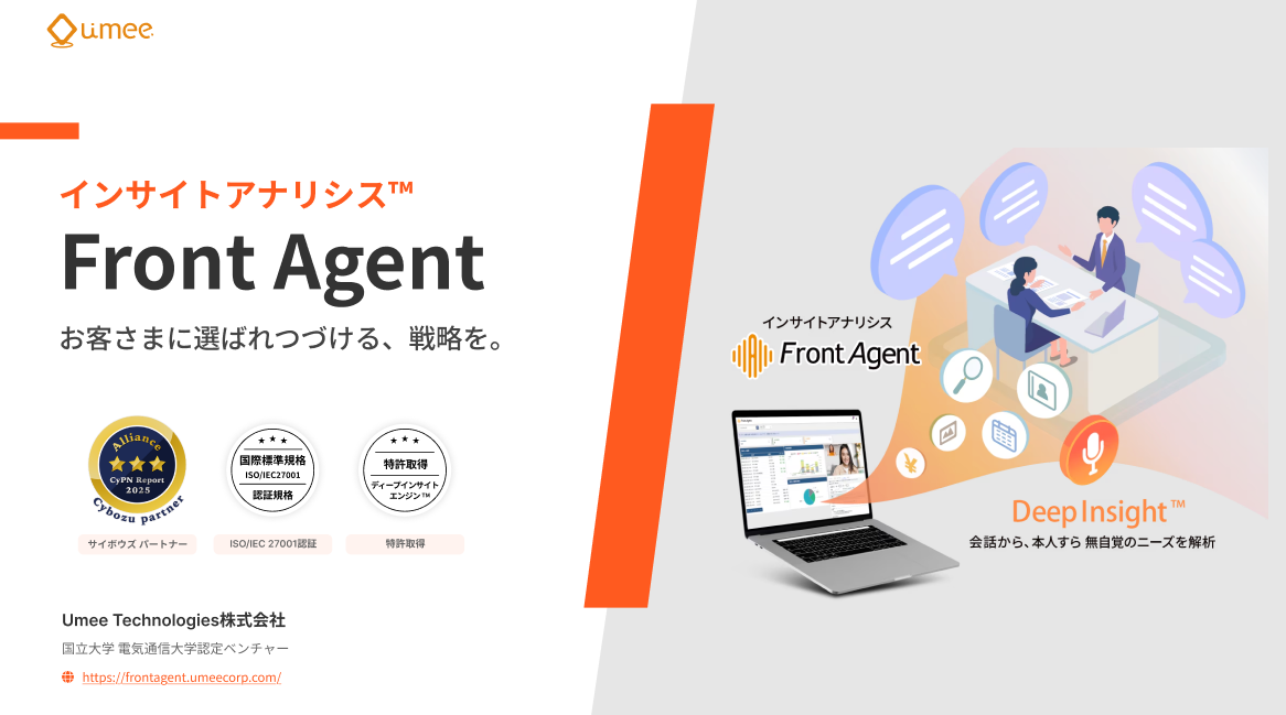 商談ビッグデータが勝ち筋に導くインサイトアナリシス™「Front Agent」を開発・提供するUmee Technologies株式会社(本社:東京都調布市、代表取締役:新納 弘崇、以下「ユミー」)は、サイボウズ株式会社が提供する「kintone(キントーン)」を利用中の企業に向け、Front Agentの具体的な活用方法と導入効果をまとめたホワイトペーパー『kintone×Front Agentの活用法が分かる導入事例集』を、公開いたしました。