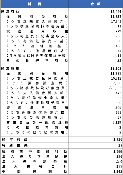 一方、保険引受費用が11,395百万円(対前年同期比8.2%増)、営業費及び一般管理費が5,119百万円(同4.6%増)、その他経常費用が2百万円(同0.9%減)となり、経常費用は17,108百万円(同7.2%増)となりました。