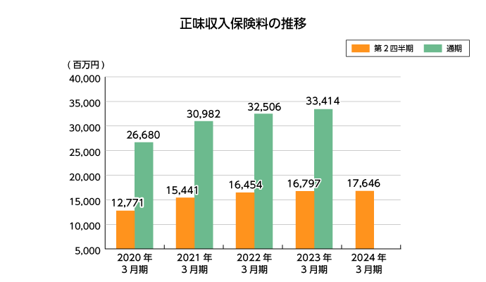 元受正味保険料(※1)が26,036百万円(対前年同期比4.2%増)、正味収入保険料(※2)が17,645百万円(同5.1%増)、保険引受収益が17,657百万円(同4.2%増)となり、経常収益は18,424百万円(同4.4%増)となりました。