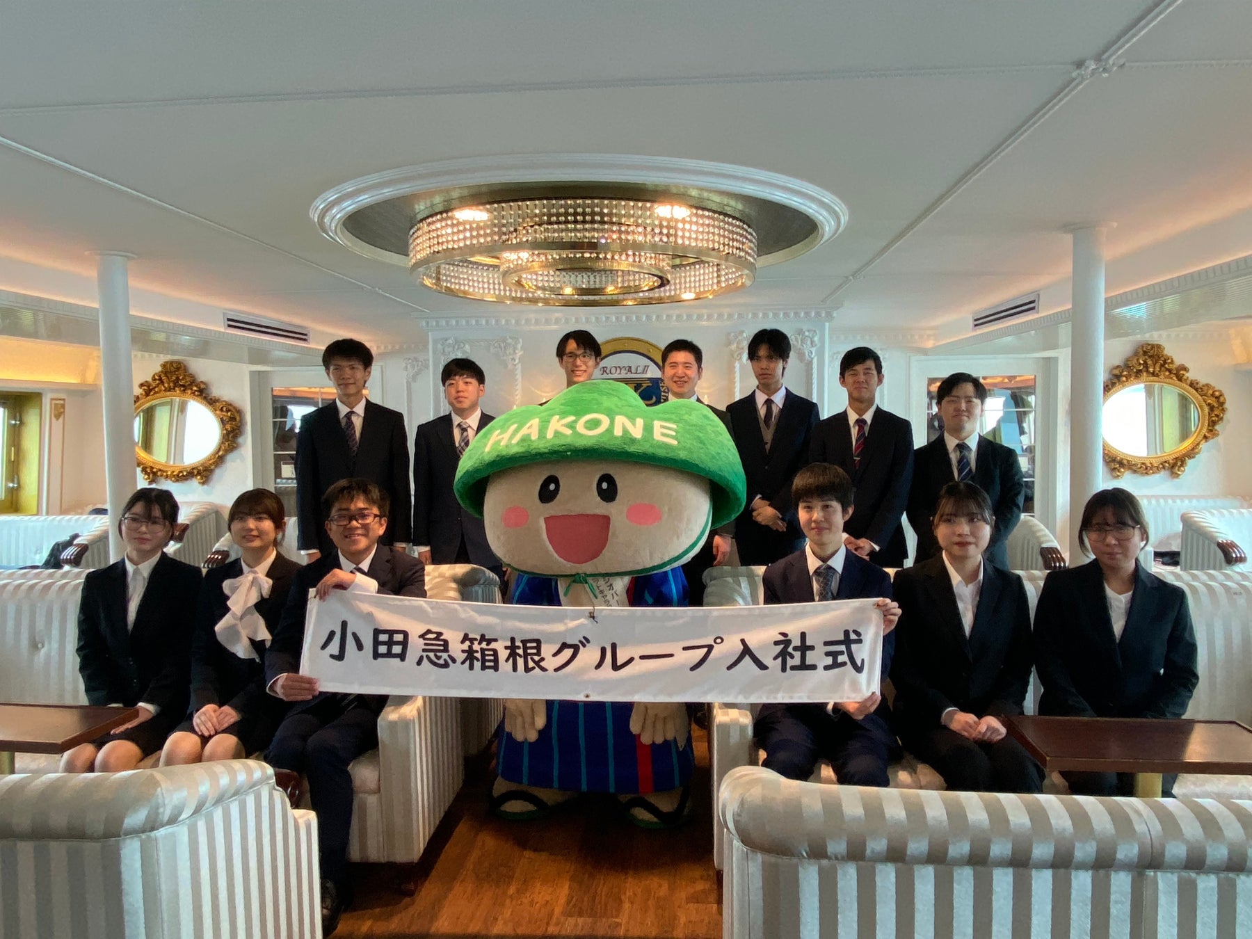 小田急箱根グループは、お客さま、地域の皆さま、従業員を大切に、箱根における心躍る時間を創造し、未来へつないでいくことを企業理念に掲げています。社会人デビューを航海の船出に例えて、ワクワクとした冒険(挑戦)の始まりとして長く心に刻めるよう、サプライズで実施しました。入社式は芦ノ湖を1周、約1時間かけて行い、最初は緊張する様子が見られた新入社員も、箱根のマスコットキャラクター「はこジ郎」や仲間達との記念撮影で笑顔の輪が広がり、新社会人としての決意を新たにしました。