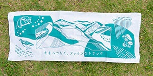 「未来へつなぐ、ファインなトラック」のオリジナル手ぬぐい。イラストレーター・神田めぐみさんのイラスト・デザインです。