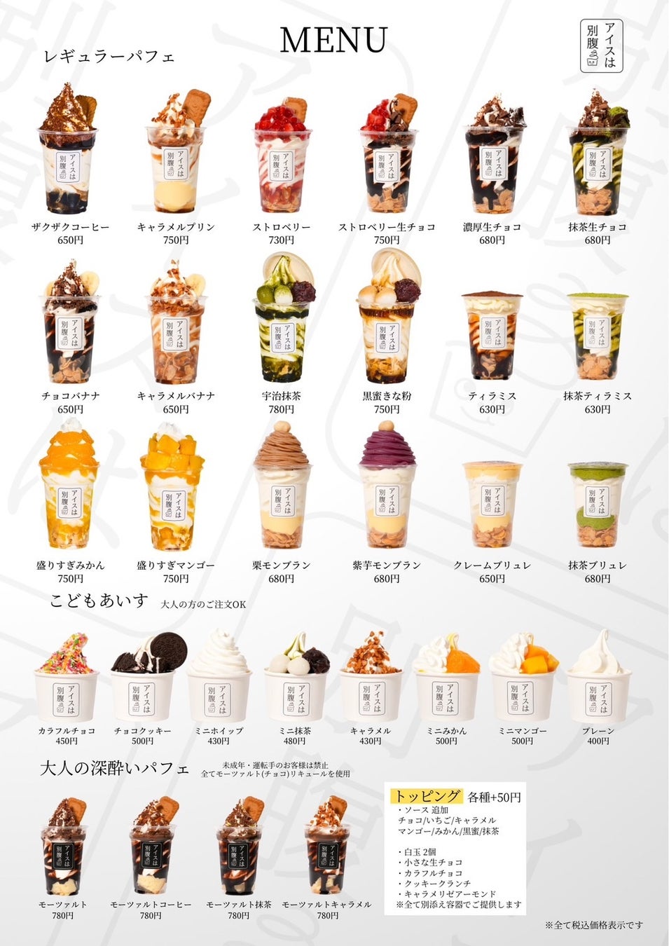 店舗では、マンゴーが山のようにトッピングされた「盛りすぎマンゴー」(750円)、表面をキャラメリゼした濃厚カスタードクリームをたっぷり入れた「クレームブリュレ」(650円)、もち米の最中、粒あん、白玉をのせ、抹茶ソースをかけた「宇治抹茶」(780円)などカップパフェ約20種類のほか、小腹が空いた時やお子さま用のミニサイズ「こどもあいす」(8種、400円~)や締めパフェとしておすすめのリキュールソースをかけた「大人の深酔いパフェ」(4種、780円)などさまざまなシチュエーションで夜パフェをお楽しみいただけます。