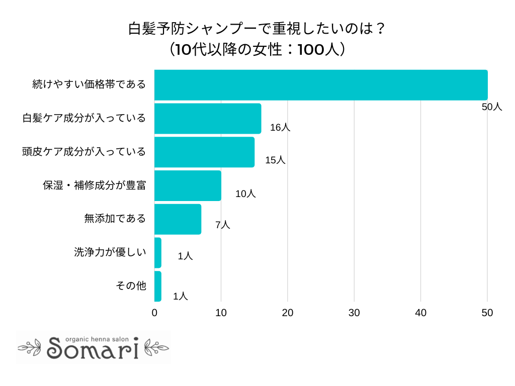 株式会社AWA(https://a-w-a.co.jp/)が運営する地域密着型白髪染め専門美容室ソマリ(https://a-w-a.co.jp/hennasalonsomari/)は、日本全国の10代以上の女性を対象に「白髪予防シャンプーで重視したいのは?」とアンケート調査を実施しました。