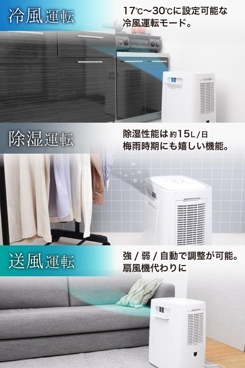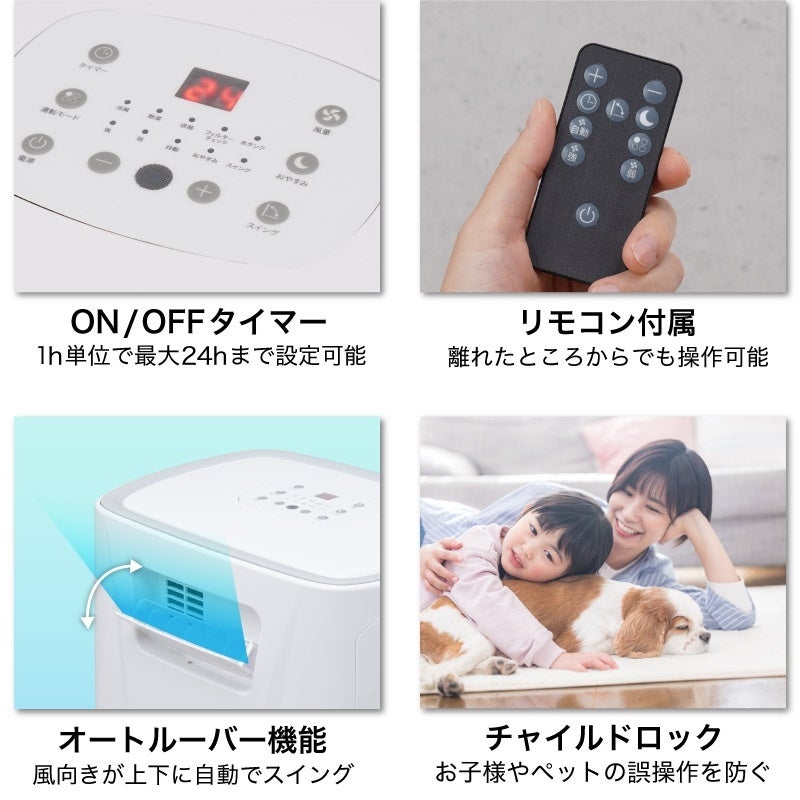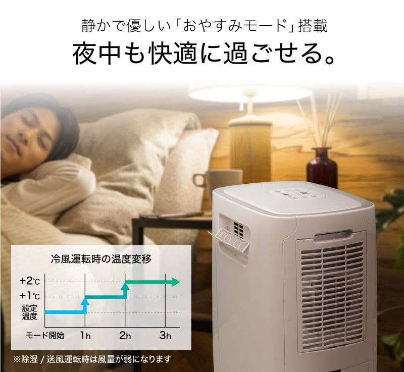 風量は強、弱、自動の3段階。冷風、除湿、送風、おやすみモードを搭載。