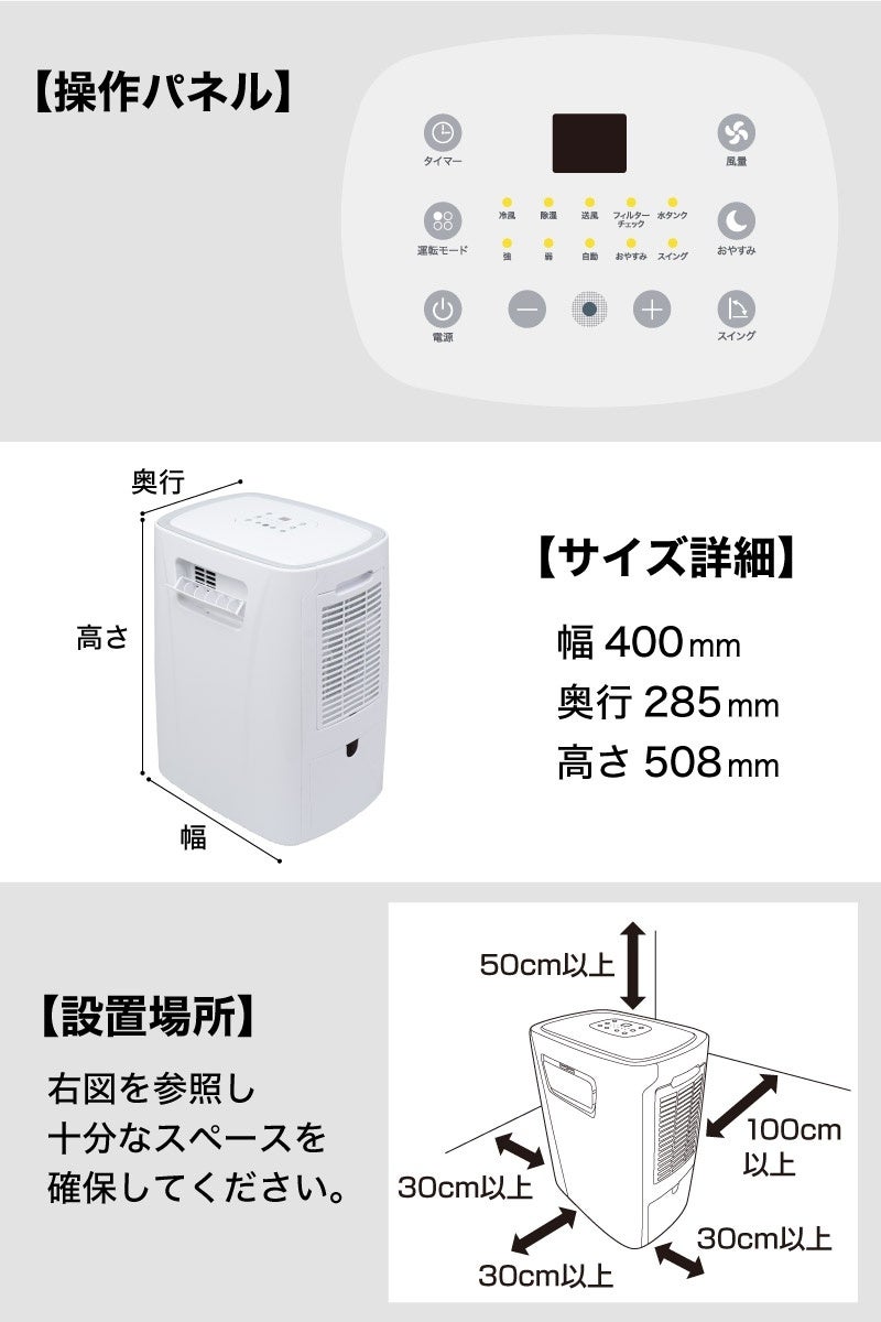 サイズは幅40×奥行28.5×高さ50.8cm。通常のエアコンと同様にコンプレッサーを搭載。周囲温度より約12度低い冷たい風を送風します。(※1)