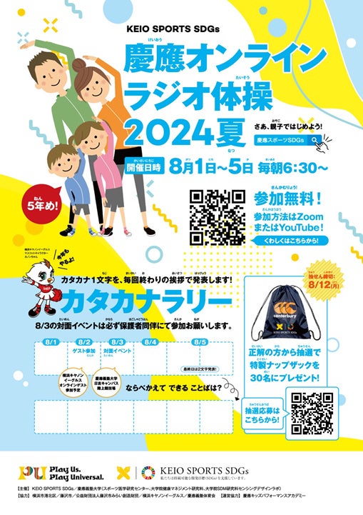 8月1日(木)から5日(月)の5日間、オンラインを活用した20分程度の早朝運動プログラムを実施し、夏休み中の運動不足解消と生活リズム維持を目指します。毎回多様なゲストや専門家を招き、SDGsやスポーツに関するミニ講座も行います。さらに、毎回発表されるカタカナを集めてプレゼントに応募できる「カタカナラリー」も実施予定です。また、8月3日(土)は、慶應義塾大学日吉キャンパス陸上競技場でのリアル体操・イベントを同時開催します。