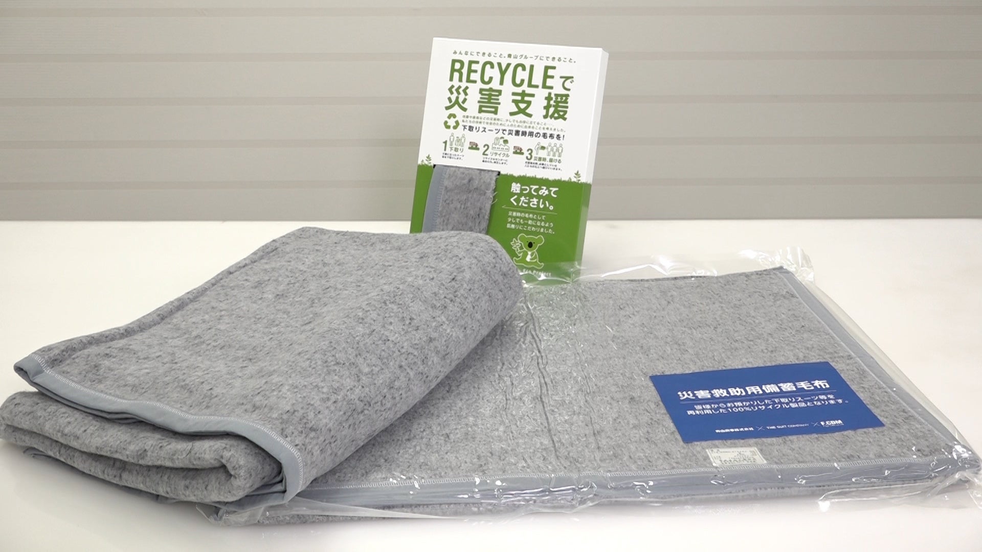 防災毛布は、店頭で回収したスーツ等の一部をリサイクルして作られています。当社では、お客様と取り組むエコ活動の一環として、着なくなった衣料品を「洋服の青山」「スーツスクエア」などで回収し、クーポン券と交換しています。回収した衣類は、主に海外でのリユースや、車の断熱材・荷物の緩衝材などにリサイクルされており、2018年からは近年の全国的な自然災害の激甚化・頻発化を鑑みて防災毛布へのリサイクルも開始しました。全国47都道府県(離島含む)に営業店を展開する当社として、被災の経験から災害対策に取り組む地域住民の皆様に少しでもお役立ていただければと、2019年より自治体へ寄贈しております。