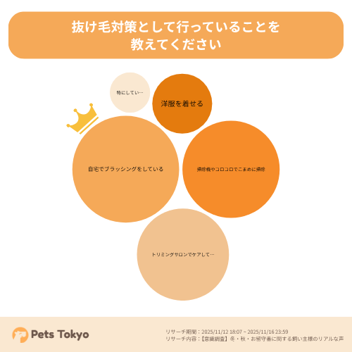 特に「自宅でブラッシングをする」はほぼ全ての回答者が選択しており、飼い主が日頃から抜け毛対策に積極的に取り組んでいる様子がうかがえます。