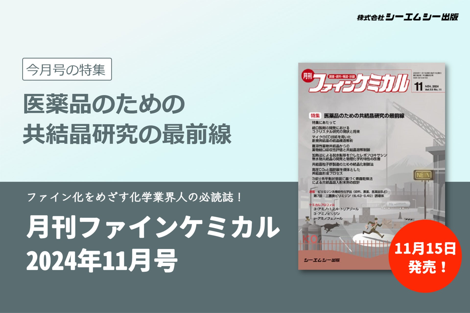 株式会社シーエムシー出版(本社:東京都千代田区神田錦町1-17-1、代表取締役:金森洋平)は、 雑誌『月刊ファインケミカル2024年11月号』(定価:税込7,700円)を、2024年11月15日に発売いたします。 本誌は当社ECサイトおよび全国の書店にてご購入いただけます。
