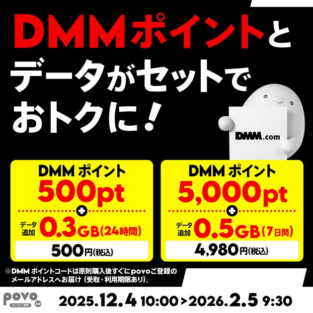 KDDI、沖縄セルラーは2025年12月4日から、povo2.0の「コラボトッピング」として、「DMMポイント500pt」と「0.3GB(24時間)」がセットになったトッピングを500円、大容量の「DMMポイント5,000pt」と「0.5GB(7日間)」がセットになったトッピングを4,980円で提供します。