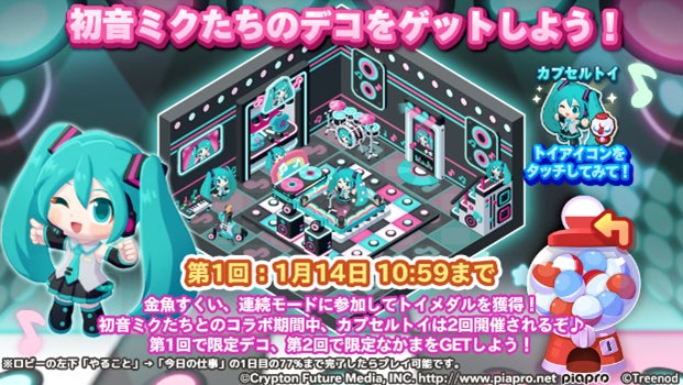 期間中、『初音ミク』シリーズのコラボを記念したオリジナルデコが登場します。今回は、「初音ミク」をモチーフにしたデコ13種類、「鏡音リン・レン」をモチーフのデコ6種類、「巡音ルカ」「KAITO」「MEIKO」モチーフのデコ3種類を用意しました。イベントをクリアしたり、カプセルトイを回したりすることでコラボオリジナルデコを入手可能です。