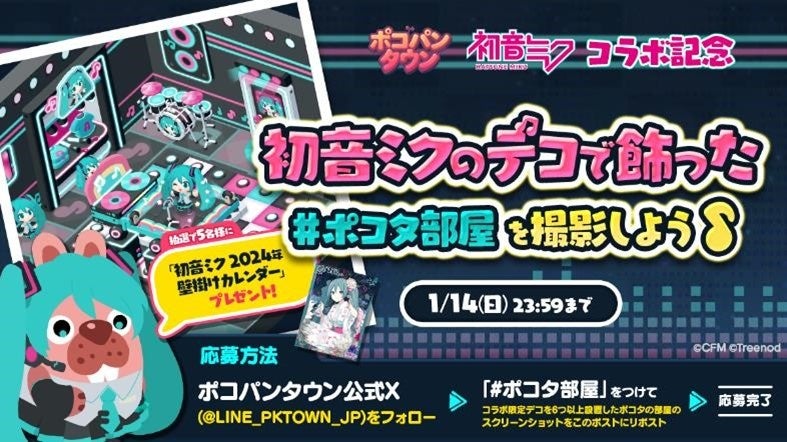 期間中、「LINE ポコパンタウン」の公式X(旧Twitter)アカウントにて、ポコパンタウンにて手に入れた『初音ミク』モチーフのデコをポコタの部屋に飾って、スクリーンショットを対象ポストに引用ポストすると、抽選で5名様に『初音ミク』のカレンダーをプレゼントします。