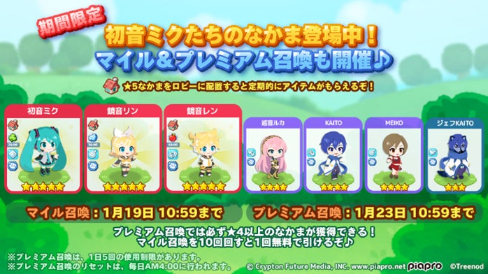 期間中、「初音ミク」をはじめとしたキャラクターが「LINE ポコパンタウン」に大集合。「★5 初音ミク」、「★5 鏡音リン」、「★5 鏡音レン」、「★4 巡音ルカ」、「★4 KAITO」、「★4 MEIKO」の6キャラクターがポコパンタウンに登場します。なかま召喚やイベントクリア時、ログインボーナスなどさまざまなところでなかまにできます。