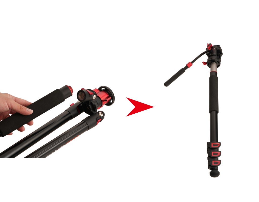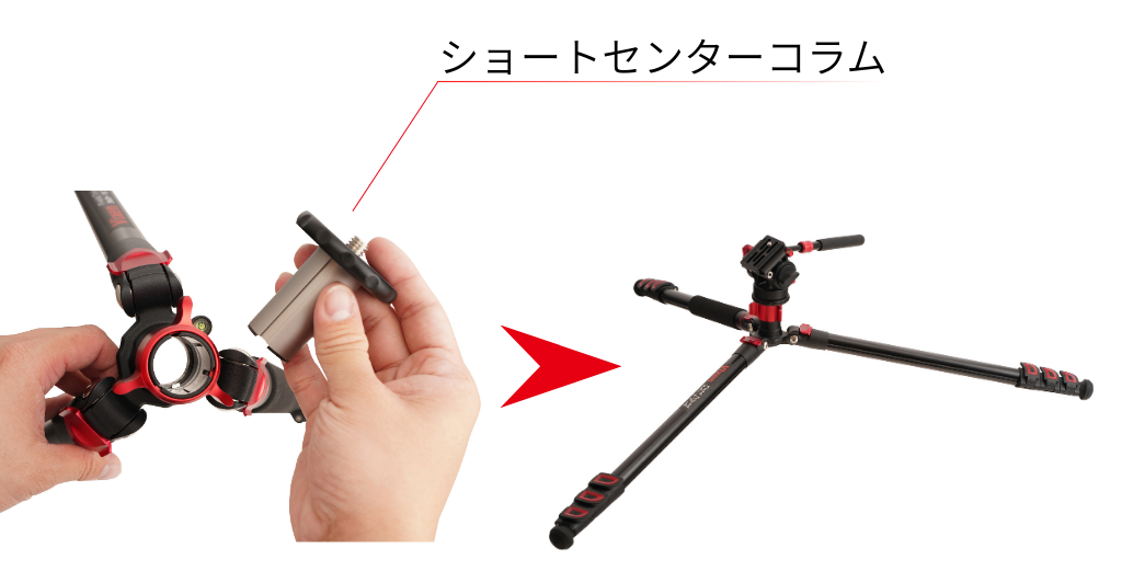 通常の高さでの使用はもちろん、付属のショートセンターコラムに交換すれば、低いアングルからの撮影(ローアングル撮影)も可能です。また、脚を取外して一脚としても使用でき、狭い場所や手持ち撮影の補助に役立ちます。