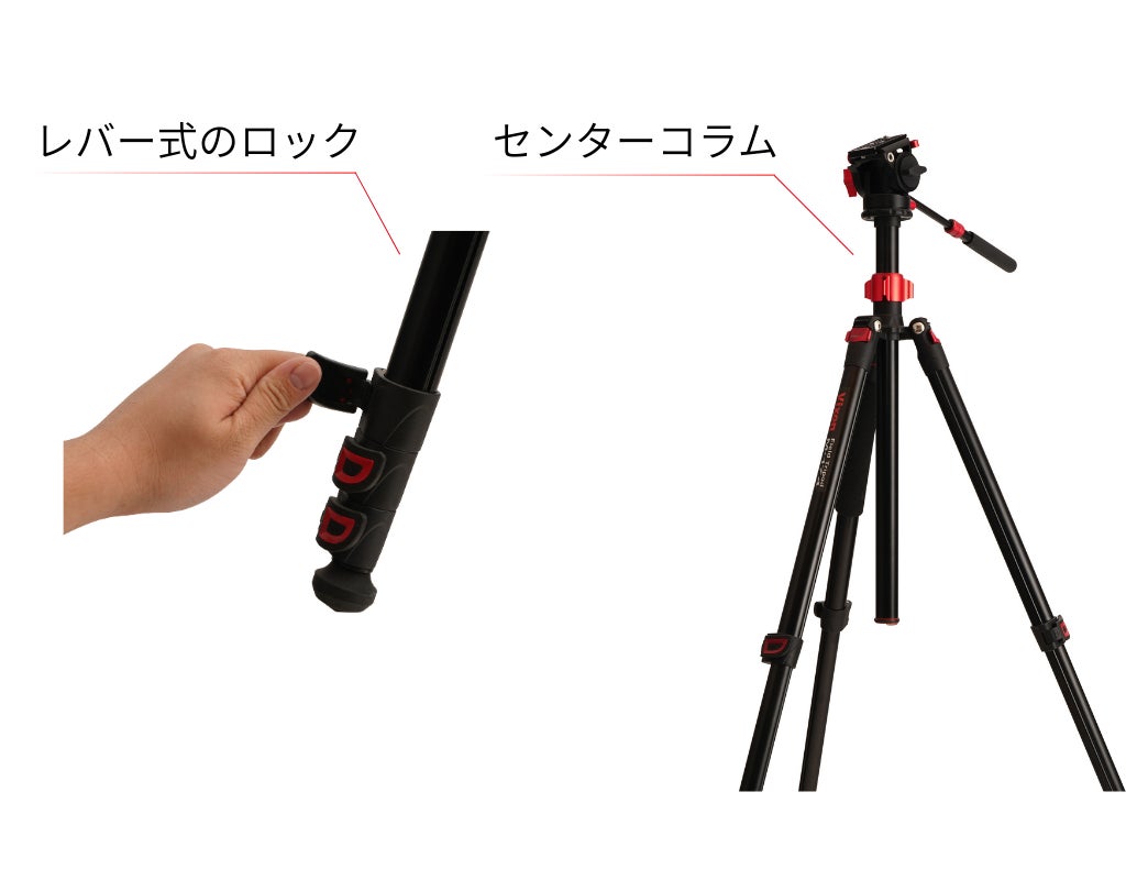 レバー式のロックで、脚の長さを素早く調整できます。センターコラムを使えば、さらに高さを出すことも可能です。