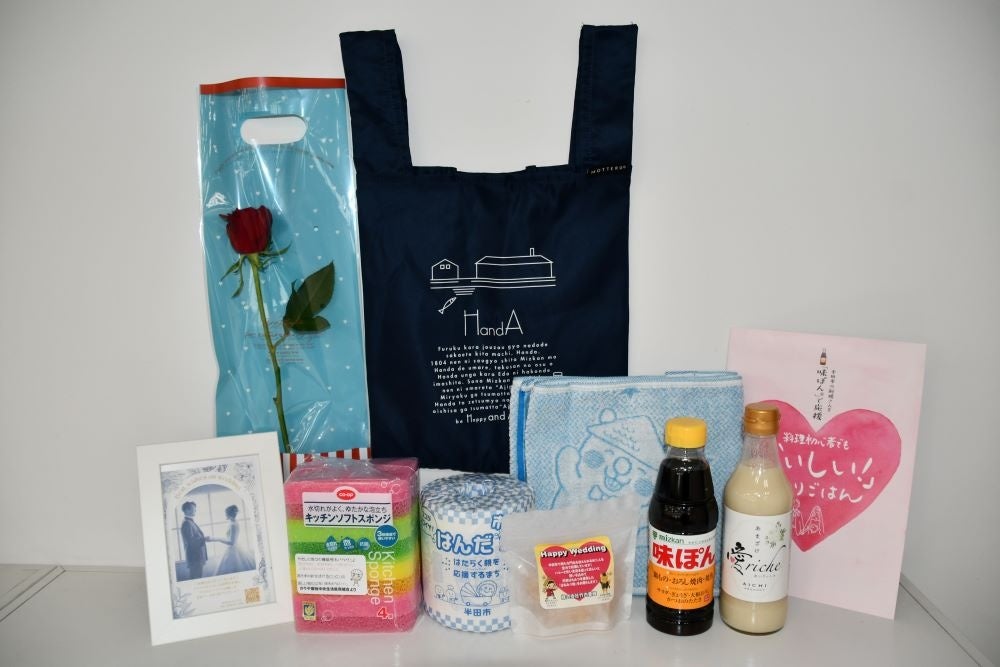 お祝い品はすべて、半田市に関わりのある事業者からの寄贈であり、市全体で婚姻するカップルを応援しています。