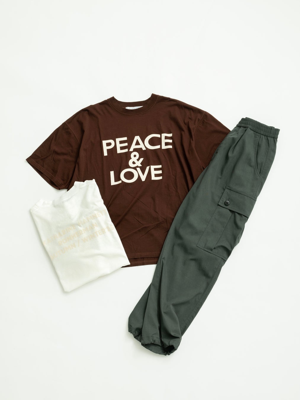 80年代より、リリースされてきたブランドの代表的アイテムのスローガンTeeのアーカイブの中から”PEACE&LOVE”を選びTシャツに落とし込みました。耳なじみのあるLOVE&PEACEではなく、私たちが住むこの場所の平和と愛を守る。自分たちの近くの平和を守れなければ、世界のことなど到底守れない。このTシャツを身に纏うことで、少しでも周りに対して愛を配れたら。という想いを込めてあえてPEACEから始まるこの言葉にメッセージを込めました。