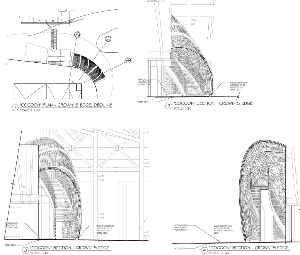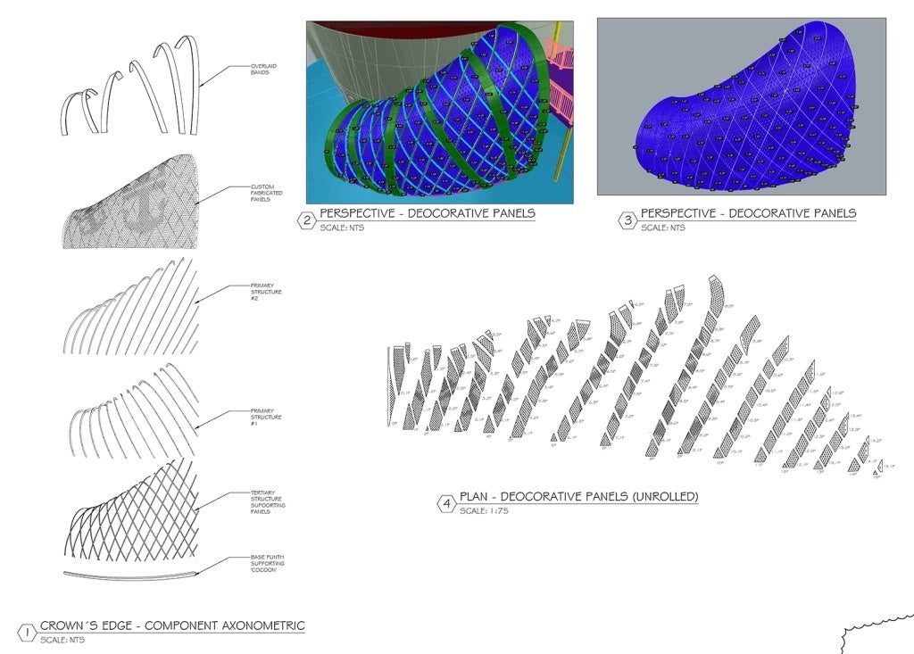 たとえば、ウォーターパークの有機的な木のような柱は Grasshopper 定義を使用して開発され、イメージ サンプリング技術には C# スクリプトが適用されました。クラウンズ エッジ では、ロイヤル・カリビアン の王冠と錨のロゴを表現するパネル化システムが使用されました。
