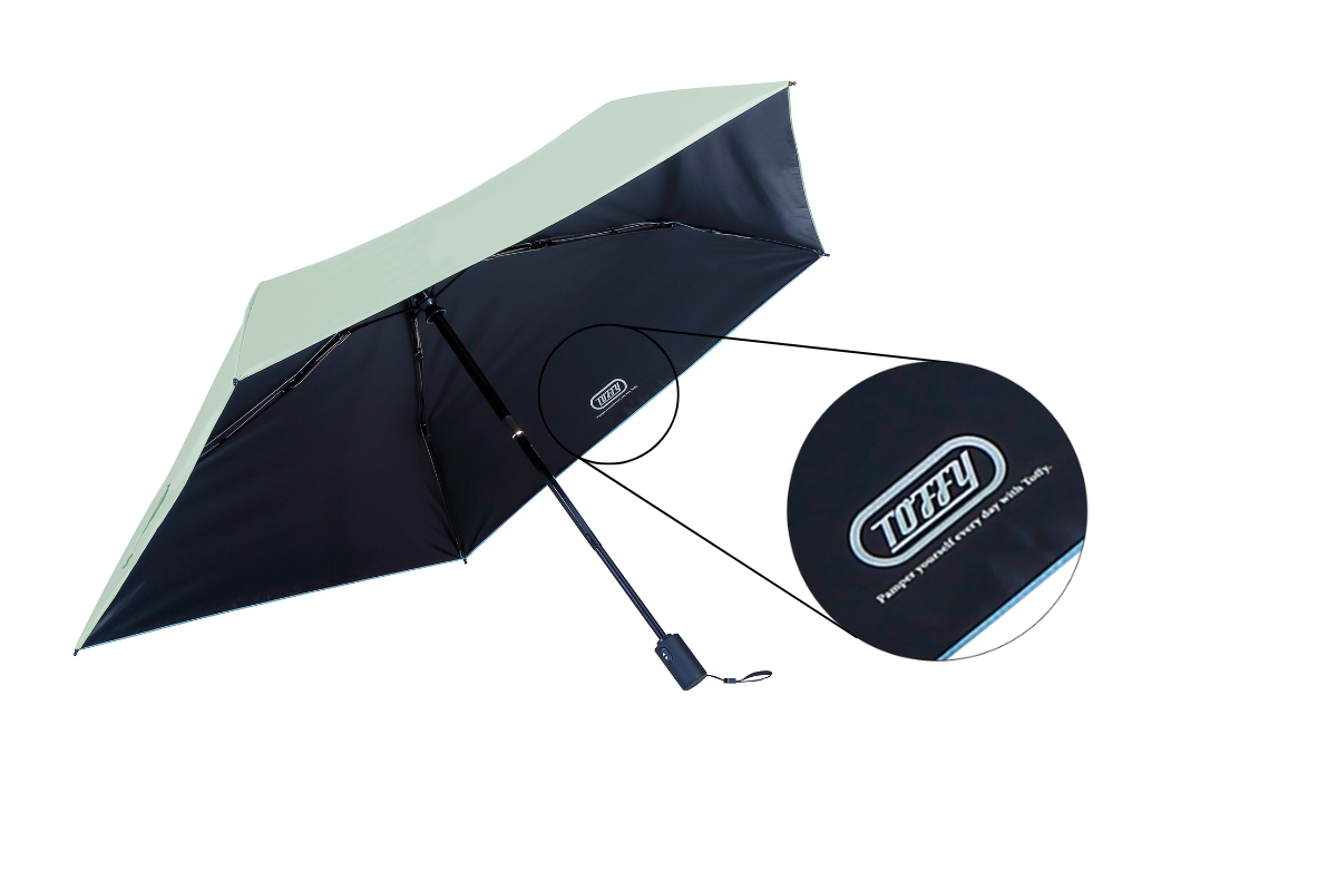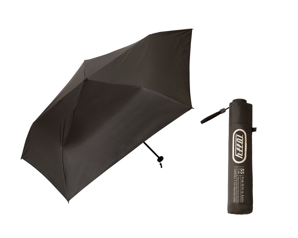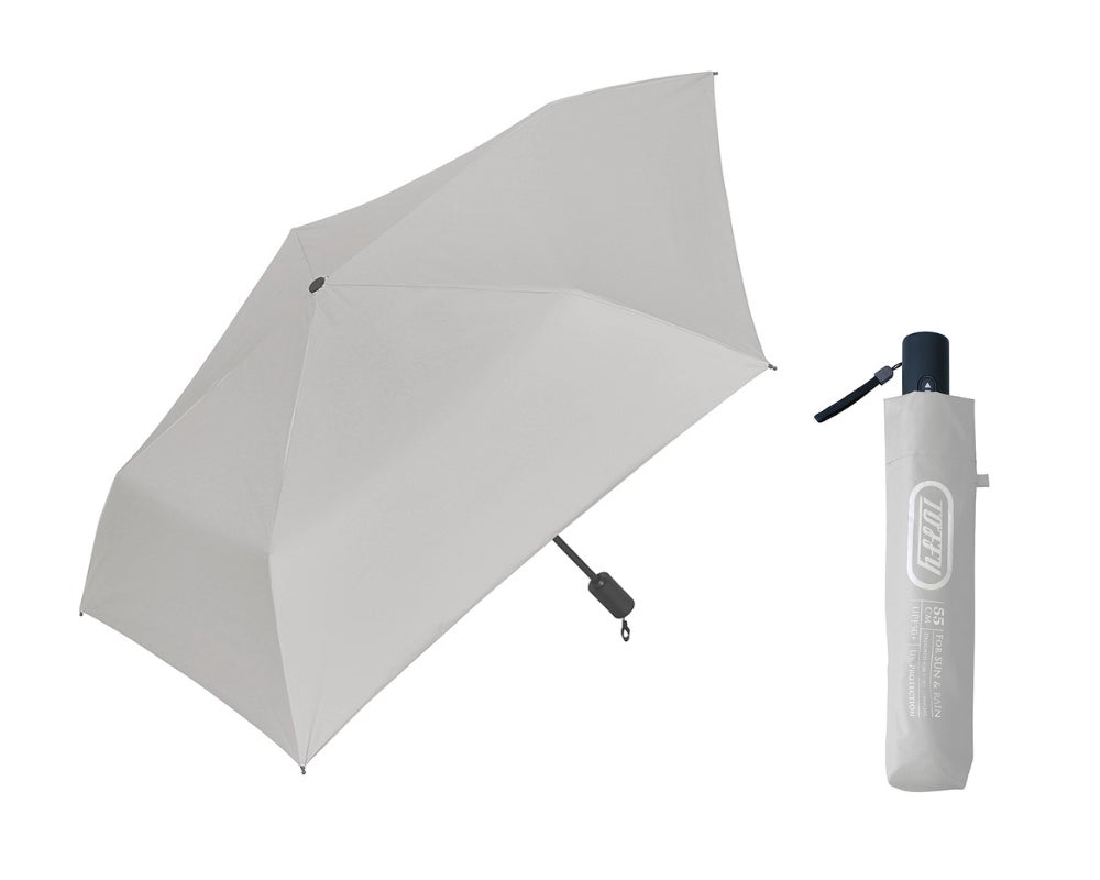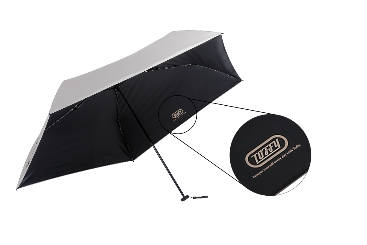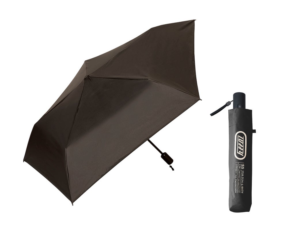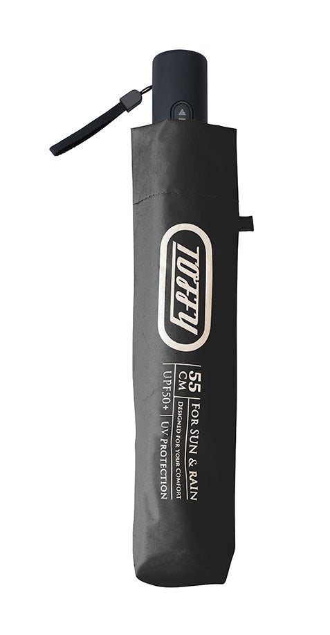 「Toffy 55cm オールウェザーUV傘」「Toffy 55cm オールウェザーUV自動開閉傘」は、日差しと紫外線を99.9%以上カットでき、遮熱効果※1に優れた晴雨兼用の折りたたみ傘です。親骨には、軽量で風に強く折れにくいグラスファイバーを採用。ハンドル部分には「Toffy」の刻印、傘内側と傘袋にプリントされているシャンパンゴールドの「Toffy」ロゴがアクセントに。親骨が55cmと男性も使いやすいサイズで、暑さ対策におすすめのアイテムです。