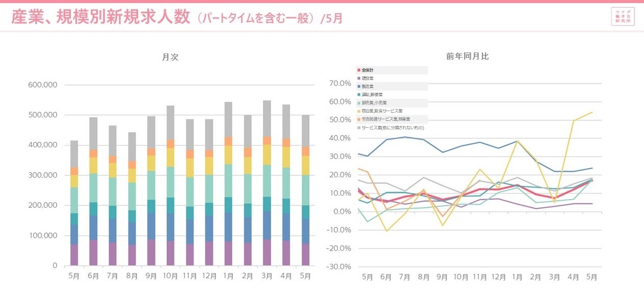 新規求人数は、前年比で+17.2%と先月(+12.3%)からさらに伸びが伸長しました。特に先月同様宿泊業,飲食サービス業は改善が著しく(+54.3%)、製造業(+23.9%)、学術研究,専門・技術サービス業(+18.4%)、サービス業(他に分類されないもの)(+18.4%)と増加しました。