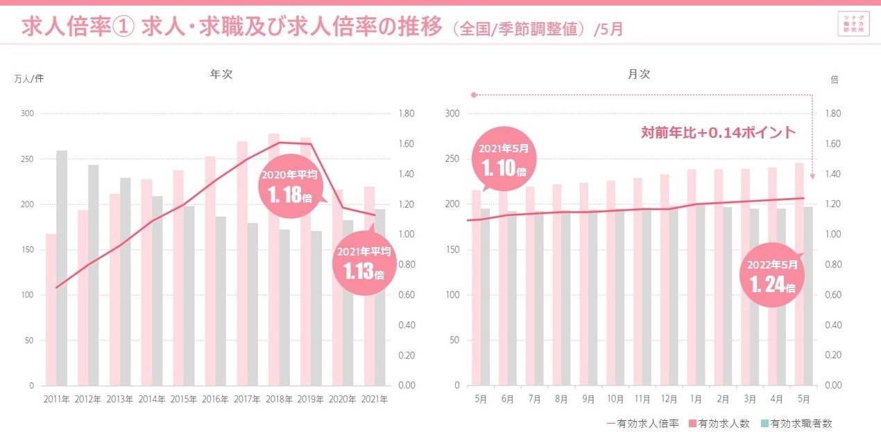 2022年5月度の有効求人倍率は1.24倍。完全失業率は2.6% 労働市場データレポート(2022年5月度版)