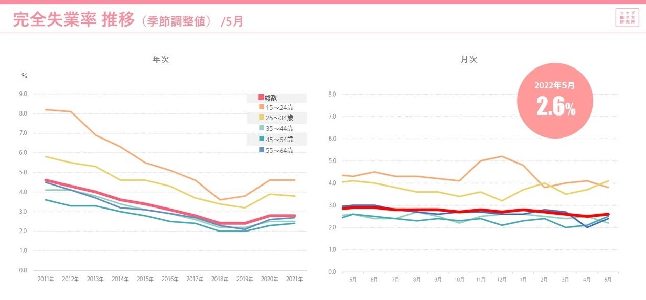 多様な働き方の調査研究機関「ツナグ働き方研究所(拠点:東京都千代田区/所長:平賀充記)」は、官公庁などが発表する労働市場関連のデータをキュレーションしつつ、分かりやすくまとめた「労働市場データレポート」を毎月発表していきます。今回は7月上旬に発表された最新データをもとに2022年5月度レポートについて、とりまとめましたのでご報告いたします。