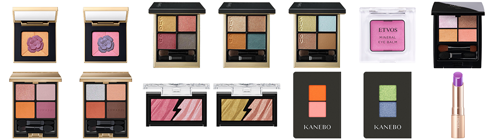 (2段左から)ルナソル アイカラーレーション / 13 Prelude Reflet・14 Amber Dusk(1/21発売)、ケイト エレクトリックショックアイズ / PK-1・YL-1(1/22発売)、KANEBO カネボウ アイカラーデュオ / 16 Pick Me・EX4 Sea Cruise(2/4発売)、オペラ リップティント N / 112 ライラック(2/9発売)