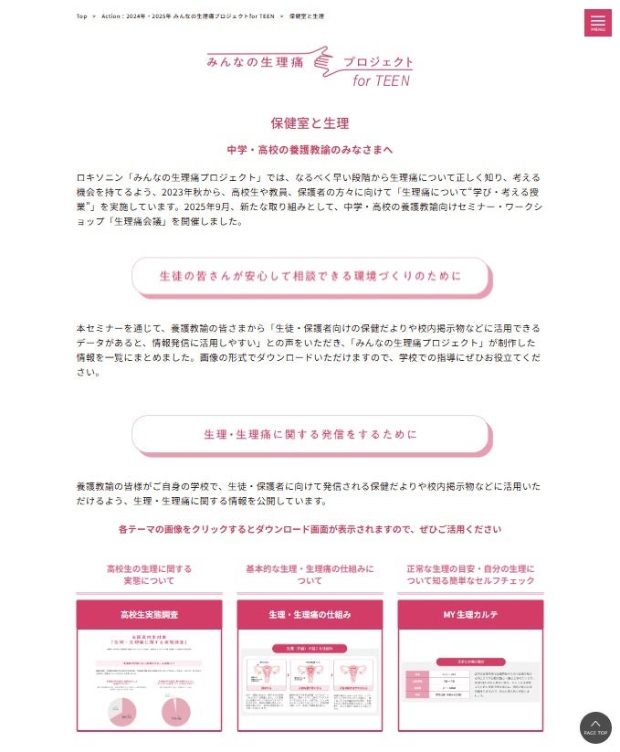 本セミナー・ワークショップで寄せられた意見をもとに、学校で養護共有の皆さんが情報発信を行う際に活用いただける情報をまとめた特設ページ「保健室と生理」をロキソニン「みんなの生理痛プロジェクト for TEEN」サイト内に公開しました。本ページでは、生理痛に関する正しい情報や実際に学校で取り組んでいる事例を紹介するとともに、生徒へ配布する「ほけんだより」等でも活用可能なデータや保健教材・冊子をダウンロードいただけます。