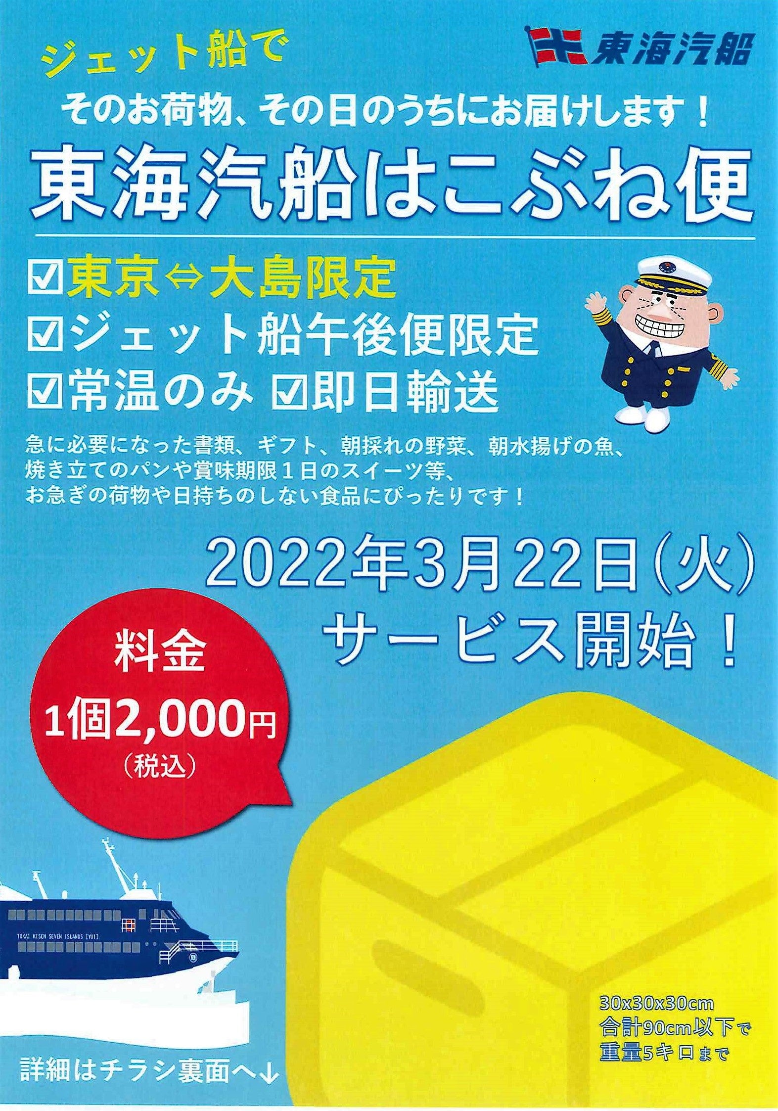 東海汽船株式会社 https://www.tokaikisen.co.jp (本社:東京都港区、代表取締役社長:山﨑潤一、)は、高速ジェット船就航20周年を迎えるにあたり、2022年3月22日(火)より高速ジェット船による東京⇔大島間の小型荷物の輸送を開始いたします。