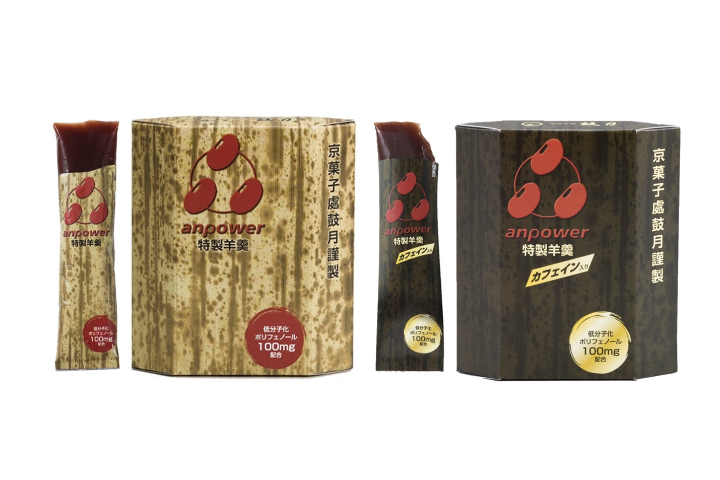 エネルギー補給羊羹「anpower(アンパワー)」は、約3年の開発を経て2019年6月に販売を開始しました。この商品で使用している羊羹は、和菓子職人が自社工場で炊き上げた上生菓子用の餡を使用しています。また、熱中症対策に効果的な塩分(ナトリウム)と必須アミノ酸BCAAにたんぱく質の豊富な小豆の力が合わさったスポーツ、アウトドア向けの栄養補給食です。anpower(画像:左)とanpowerカフェイン(画像:右)の2種類ありますが、anpowerカフェインには、anpowerの成分に加え、超臨界二酸化炭素法によって抽出した天然の無水カフェインと血糖値の上昇を穏やかにするパラチノース配合し、さらに上を目指すアスリートのための補給食となっています。