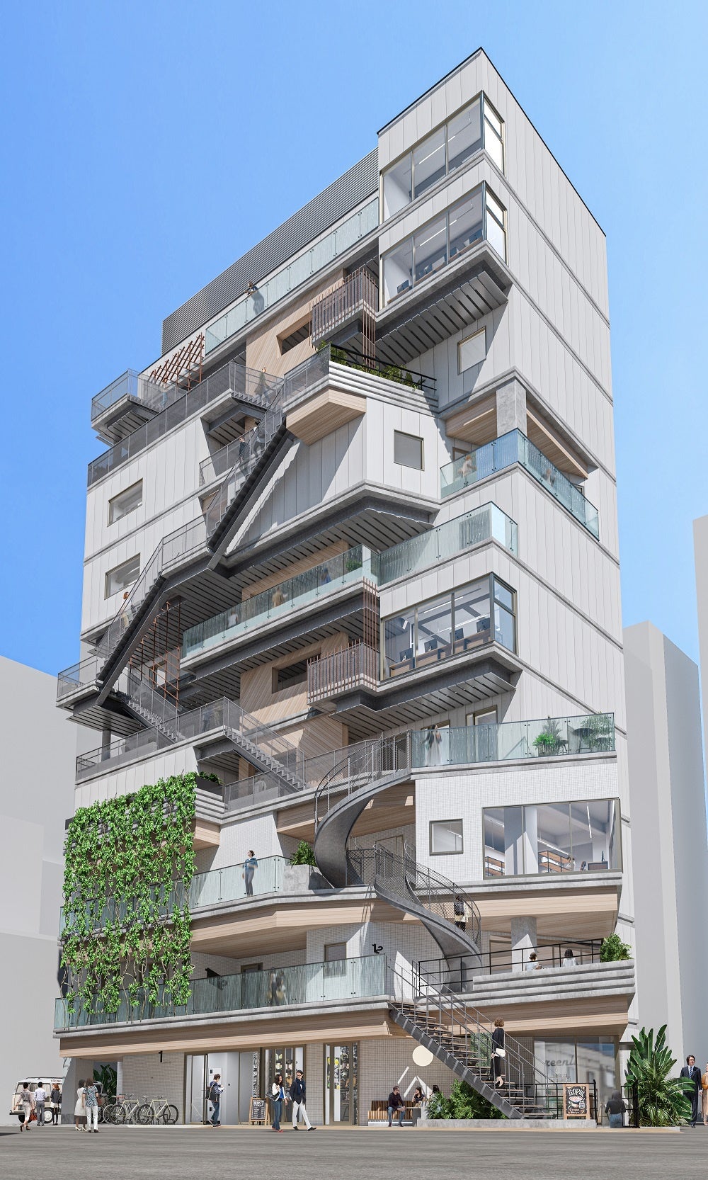 オフィスというビルディングタイプは、セキュリティのこともあり閉鎖的になってしまうことが多いのですが、『12 KANDA』ではなるべく街に開いた建ち方を目指しました。具体的には、街から直接アプローチできる「小商いオフィス」や「KOAKINAI MALL」と呼ぶ公共的な場所を低層部に設けたり、全フロアを屋外階段で繋いだ「立体的なバルコニー」をつくり、そこでワーカーが会話・作業・休憩・移動する姿を建物の立面全体で街に表示したり。『12 KANDA』での人々の振る舞いそのものが前景化し街の風景と繋がっていくような状況を目指しました。