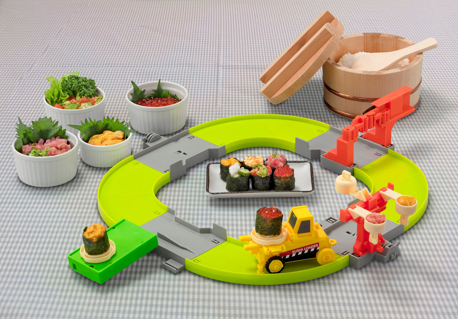 出来上がった寿しは、 「すし下駄スライダー」を貨車モードに変身させ、「すしローダー」に連結してレールの上を走ることで回転寿しとしても楽しめます。テイクアウトしたお寿しなども乗せられるので、寿しを作らなくても回転寿しマシンとしても使うことができます。