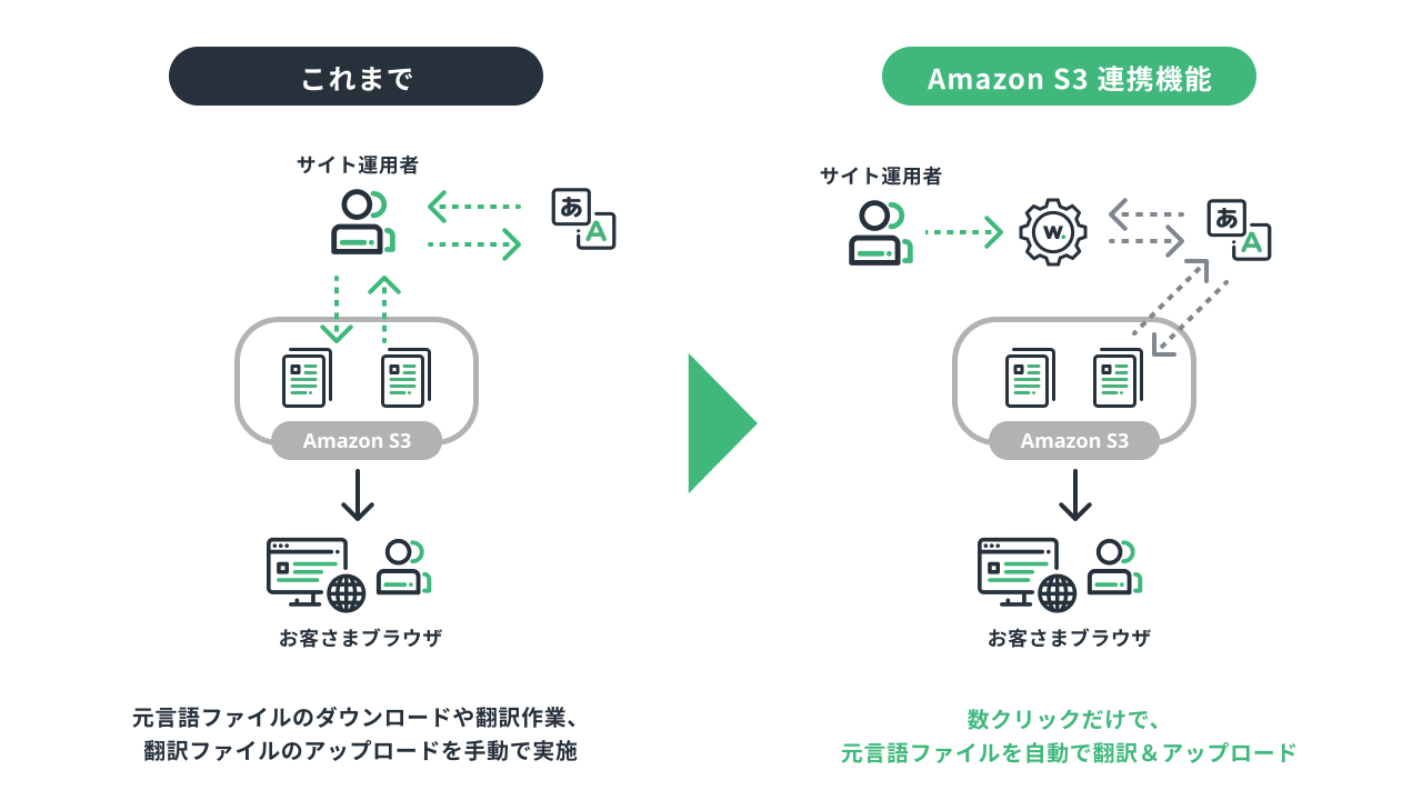 これまでは、Amazon S3 環境を利用して海外 SEO 対応可能な多言語サイトを運用する場合、一連の作業である「元言語の HTML ファイルの取込み」「翻訳作業」「翻訳した HTML のアップロード作業」などを手動で実施いただく必要がございました。このため、多言語サイトの公開にかかる運用負荷が大きく、元言語と翻訳言語での情報公開にタイムラグが生じてしまうなどの問題が生じておりました。