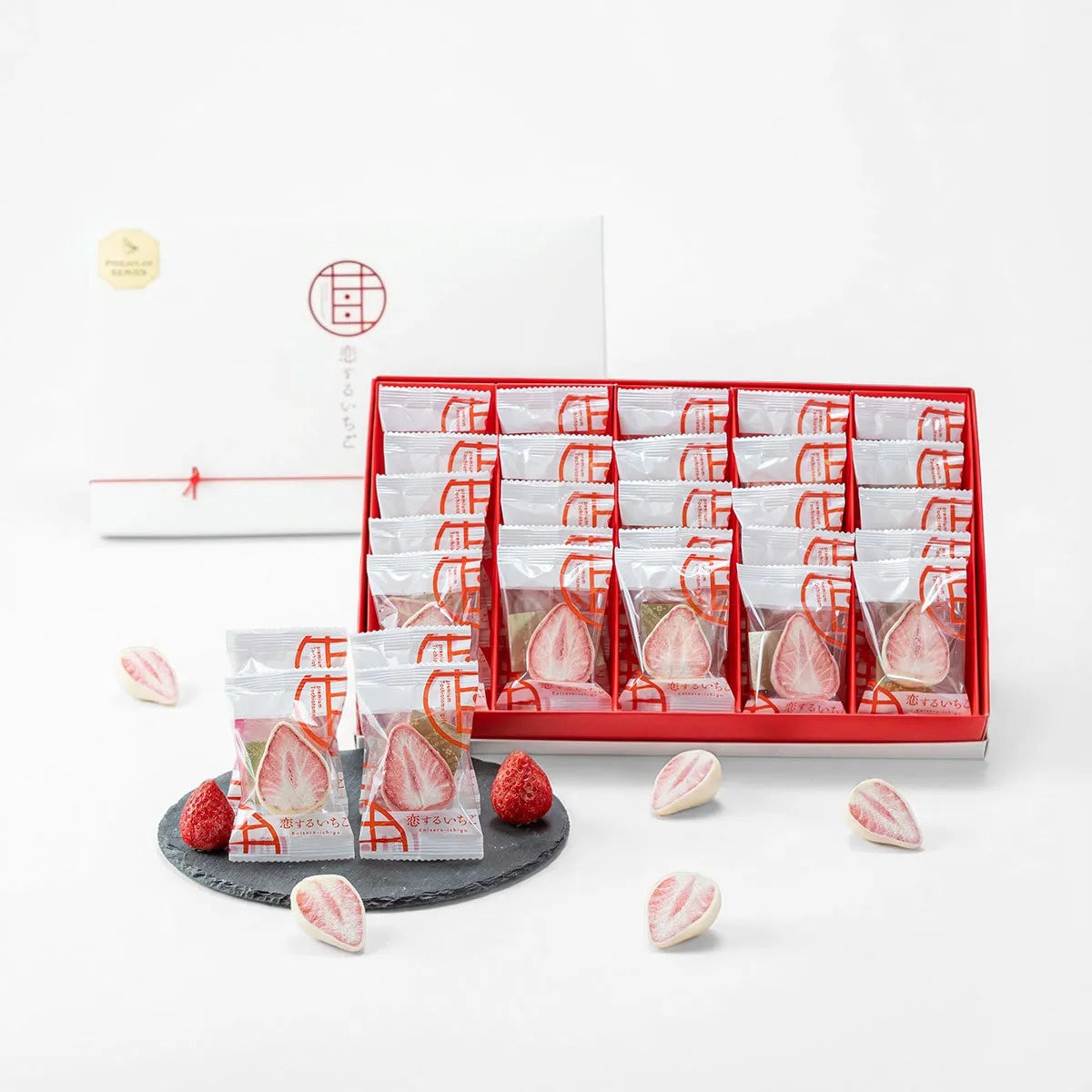 栃木県真岡市産の「特選とちおとめ」の2Lサイズのみを厳選し、フリーズドライ加工したチョコレート菓子です。サクッとした食感の後、口の中でとろけるホワイトチョコと、いちごの爽やかな酸味が重なり合います。プレーンな「ホワイト」と、とちおとめ粉末を練り込んだ「ストロベリー」の2種を食べ比べできる贅沢な詰め合わせです。