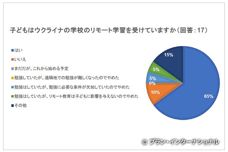 ウクライナへの帰国を予定しているか、まだ帰国について明確に決めていないものの、オンライン学習を継続している子どもは約65%に上りました。ウクライナの学校でのリモート教育は成果が上がらないと考えているか、教育を受けるための条件が整っていないため、リモート教育を受けていない子どもは10%に過ぎません。