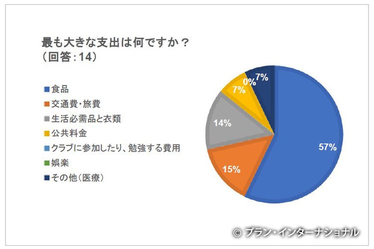 支出で最も多いのは食費(57%)です。また、交通費や生活必需品(約30%)も大きな負担となっています。